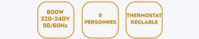 - Puissance 800 W, thermostat réglable et témoin lumineux.