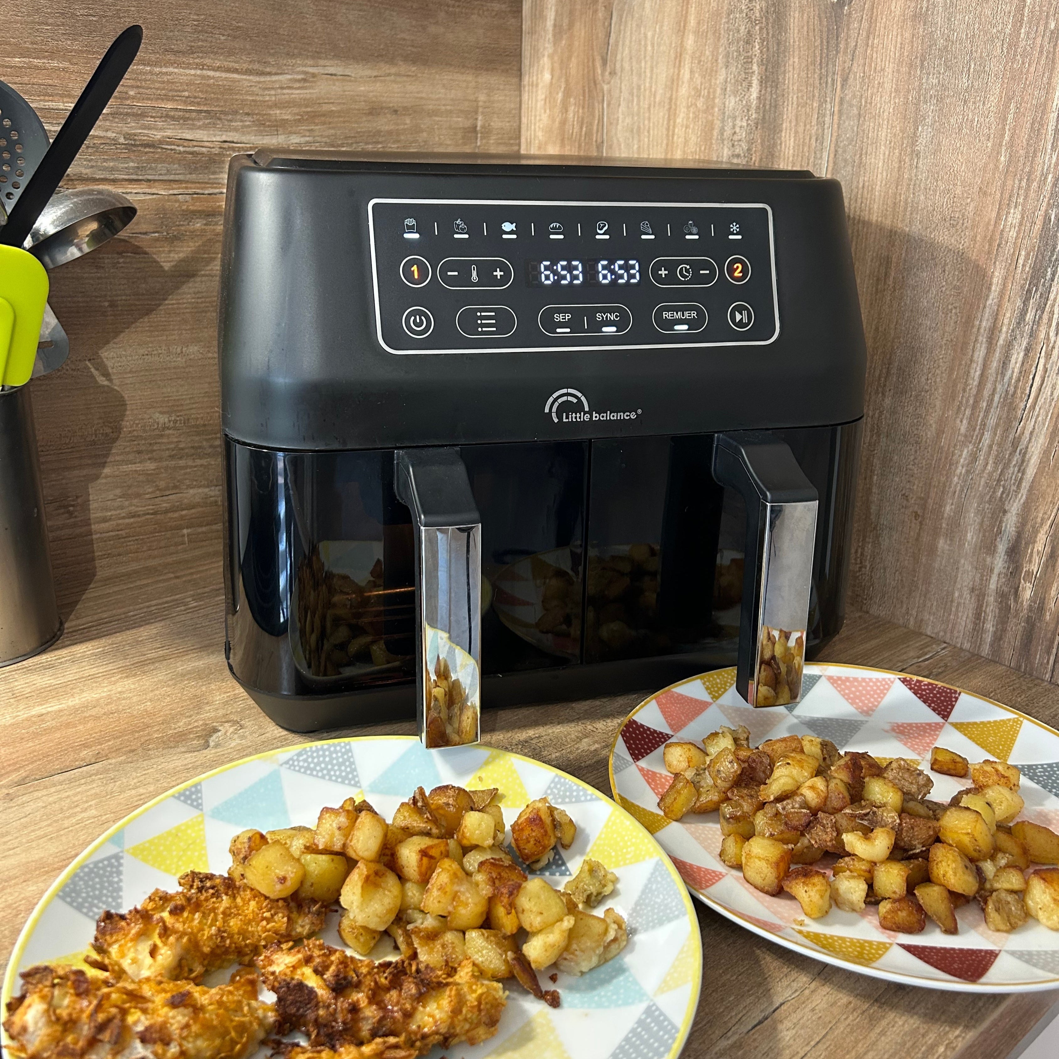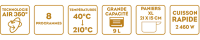 2 paniers de 4,5 litres pour un volume total de 9 litres, pour cuire, frire, rôtit, griller, réchauffer de grande quantité, plus rapidement.