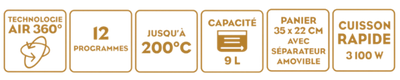 Panier 9 litres XXL pour cuire, frire, rôtir, griller, réchauffer de grandes quantités, plus rapidement. Idéale pour toute la famille, ou avec des amis (jusqu'à 6 personnes).