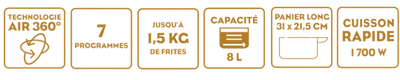 - Nombre de panier : 1 long panier d'une capacité de 8L - Revêtement anti-adhésif sans PFAS