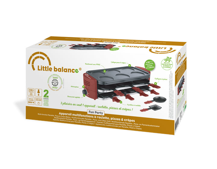 3 plaisirs en 1 seul appareil ! Notre Fun Party réunit tout ce qu’il faut pour partager un moment convivial à 8 personnes : raclette, pizzas maison et crêpes. Puissant, pratique et convivial, il deviendra vite l’incontournable de vos repas festifs.