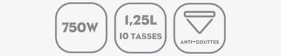 - Large-capacity filter coffeemaker: 1.25 liters, makes 10 cups of coffee in one go