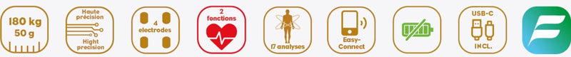 - 17 body analyses: weight, BMI, body fat, hydration, muscle mass, metabolic age...