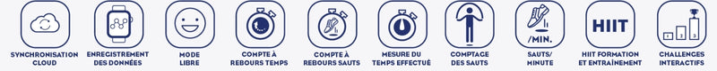 - 5 training modes available: Free jump / Timer / Countdown / Training / Interactive challenge - 7 data to precisely measure your efforts - Number of jumps visible directly on handles