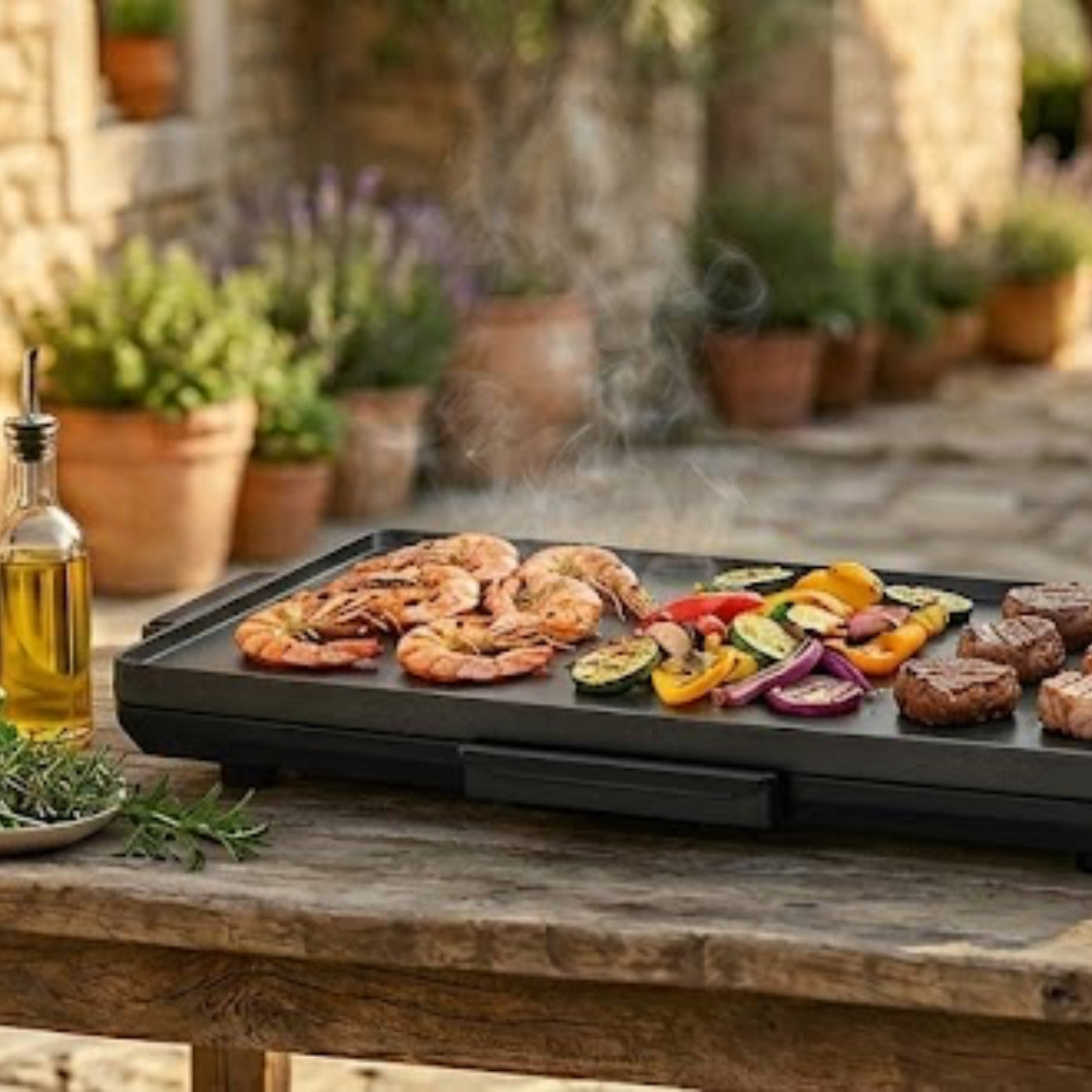 Plancha électrique pour griller viandes, poissons, saucisses, légumes, pommes de terre, tout type d'aliments sans aucune matière grasse - A l'intérieur ou à l'extérieur.