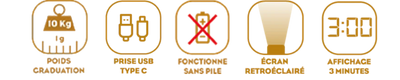 - Fonctionne sans pile, par rechargement USB : 3 heures de charge pour 6 mois d’autonomie (500 pesées environ).