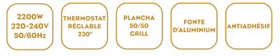- Surface de cuisson : 500 x 250 mm - 2 côtés (grill + plancha)