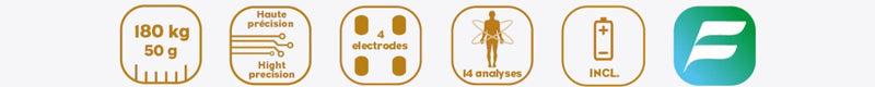 - With its 180 kg capacity and 50 g graduation, it provides you with 14 complete body analyses: weight, BMI, fat mass, muscle mass, body water, bone mass, metabolic age, etc.