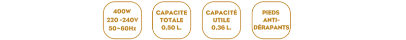 - Bol transparent pour contrôler le résultat : Capacité 500 ml - Couvercle avec système de verrouillage - Pieds anti-dérapants.