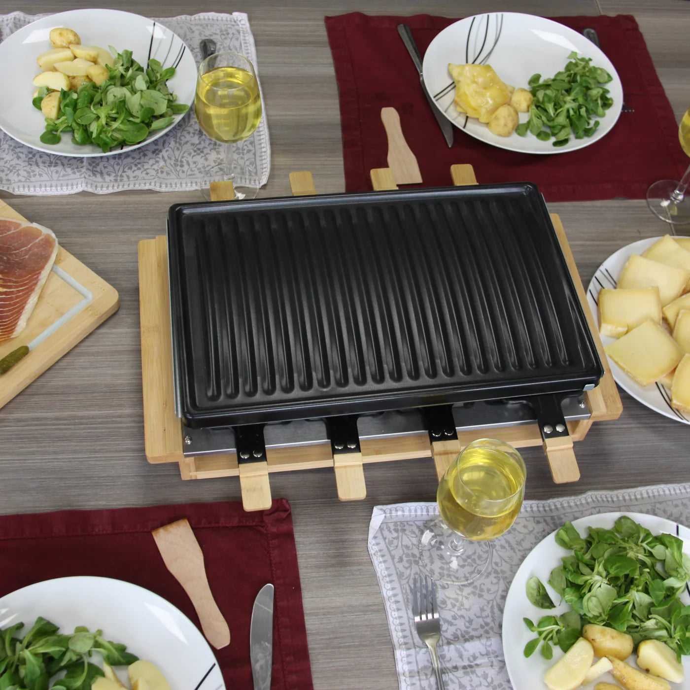 Appareil à raclette / Grill électrique Premium 8 de la gamme Les Meuuuh en bois naturel véritable : Pour savourer viandes, légumes et fromages, directement à table. Idéal jusqu’à 8 personnes.