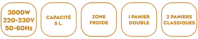 - Puissance de 3000 W permettant d'atteindre la température de chauffe souhaitée rapidement (190°C) - Thermostat réglable jusqu'à 190 °C - Minuteur - Témoin lumineux de fonctionnement - Sécurité double thermostat - 3 paniers : un grand ou deux petits.