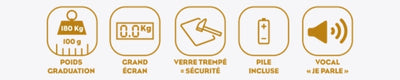 - Voice function: the weight is announced by speaking, at the same time as it appears on its digital display - 5 languages available - Volume control. Ideal for the visually impaired!