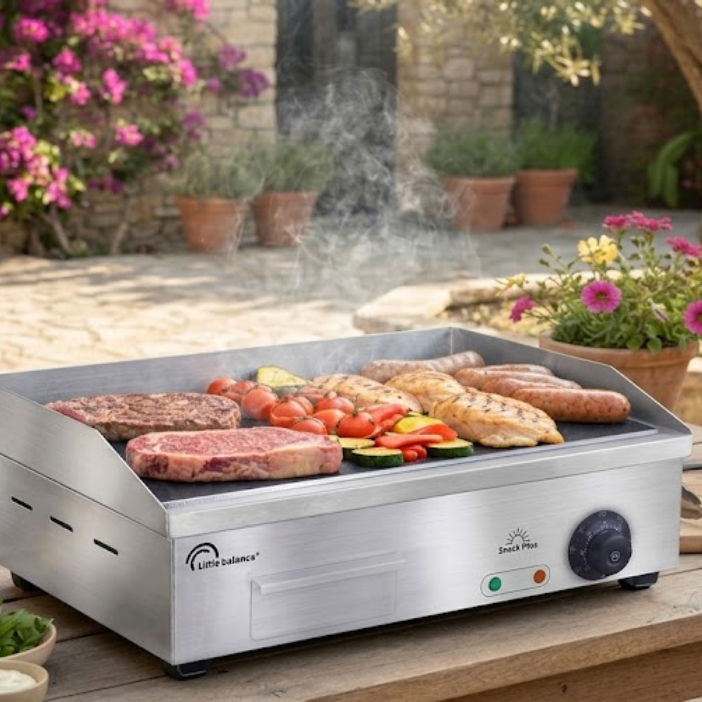 Préparez facilement viandes, poissons, légumes et grillades grâce à la plancha Snack Plus, conçue pour offrir puissance, confort de cuisson et grande surface de travail.