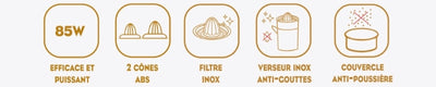 2 interchangeable cones for squeezing all sizes of fruit, from the smallest to the largest.