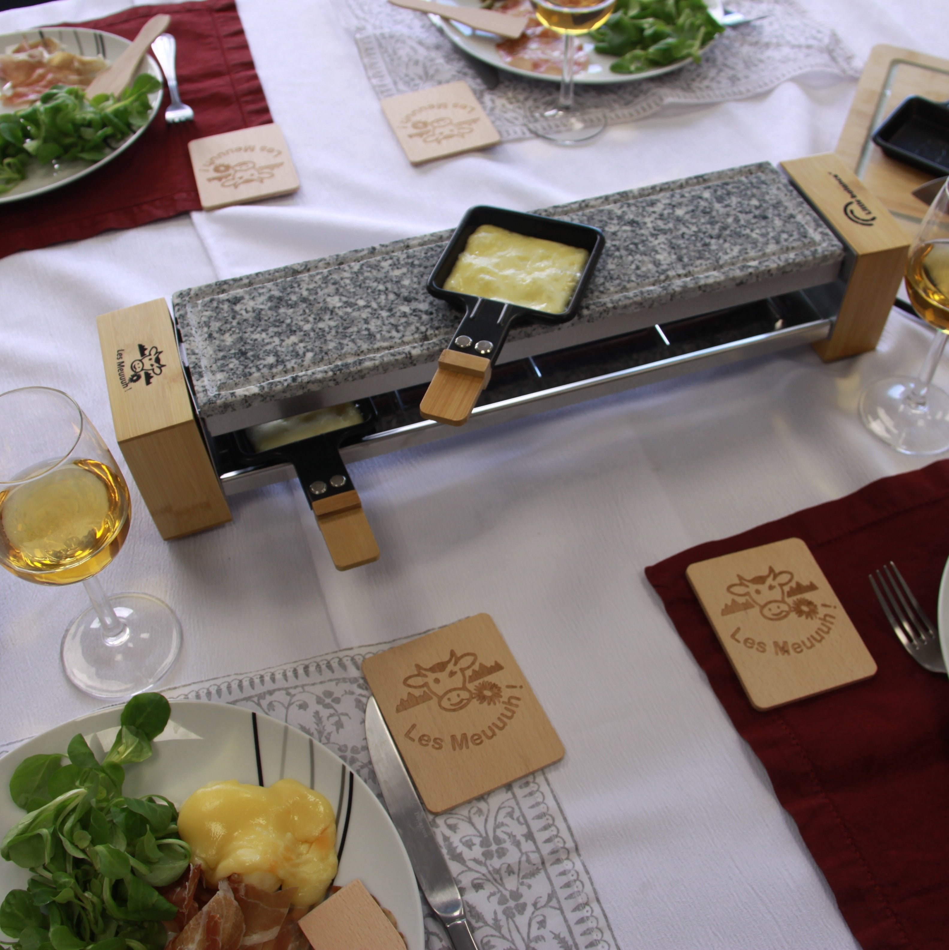 Raclette - Grill Les Meuuuh ! Idéal pour 4 personnes. Pour savourer viandes, légumes et fromages, directement à table, dans une ambiance sympas de montagne et de pâturages.