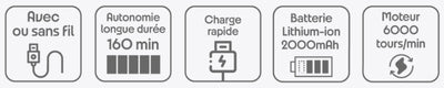- 2000 mAh lithium-ion battery: up to 160 minutes of autonomy for 160 minutes of charging