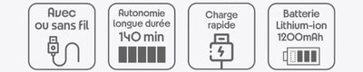 - High-quality lithium-ion battery guarantees 140 minutes of long-running autonomy, with a rapid charge of just 90 minutes. So you can use it whenever you like!