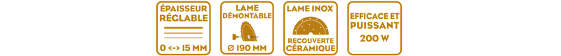 - Lame de 190 mm : Acier inoxydable, recouverte en céramique