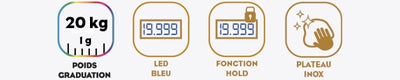 Capacité 20 kg - Graduation 1g / Fonction Tare / Quick Start