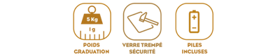 Capacité 5 kg, Graduation 1 g, Fonction tare, Auto off.