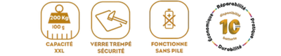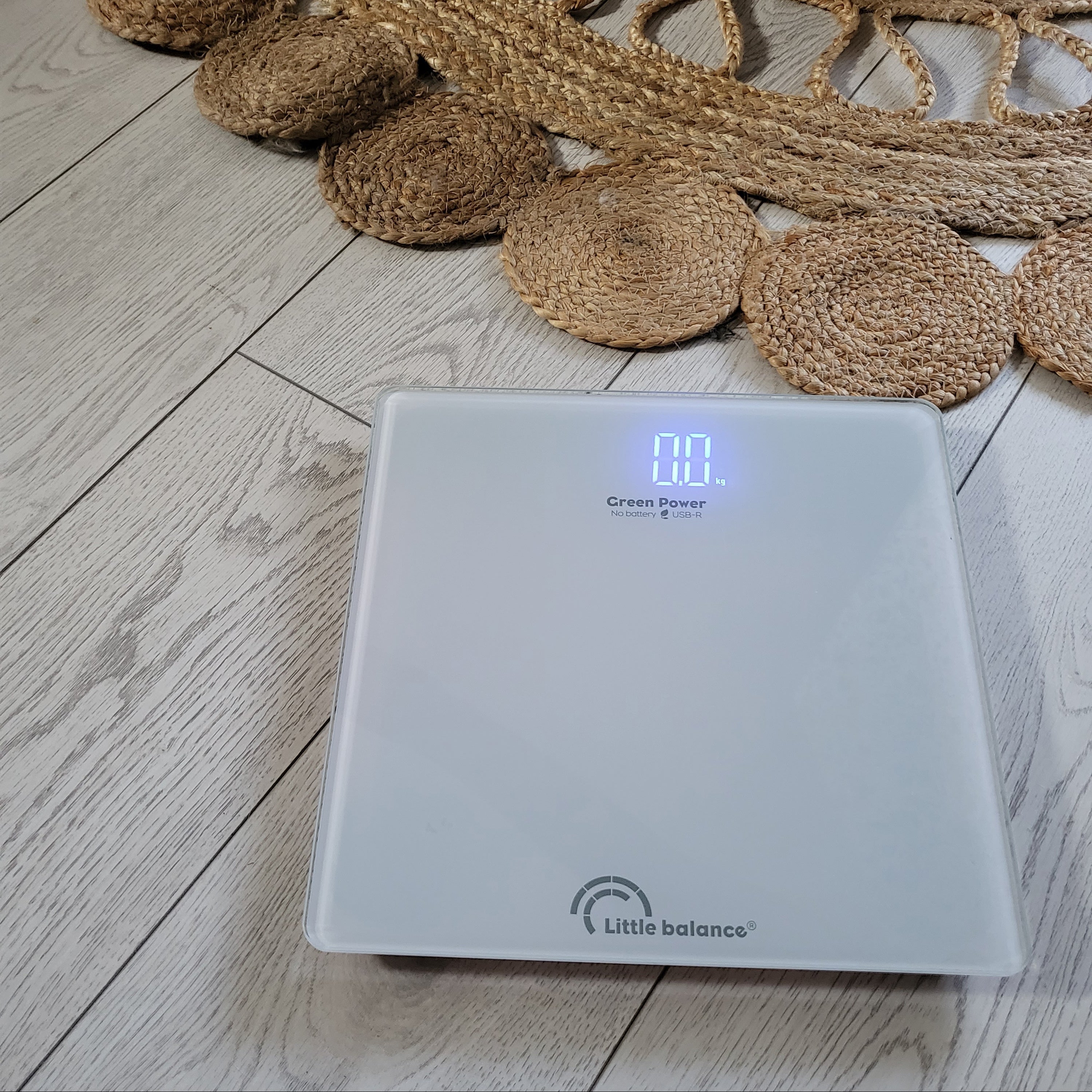 Fonctionne sans pile, par rechargement USB : 3 heures de rechargement pour 6 mois d'autonomie (500 pesées environ).
