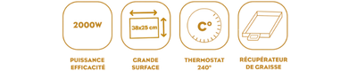 Résistances coulées dans la fonte, directement intégrées à la plaque de cuisson pour une diffusion homogène de la température, sans déperdition de chaleur et surtout sans fumée !