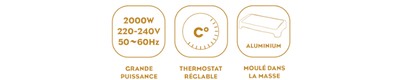 Temps de chauffe de l'appareil rapide (moins de 5 min) - Puissance 2000 W - Position Arrêt - Voyant lumineux de contrôle.