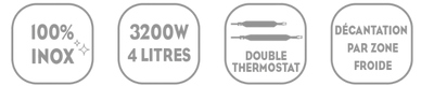 - Equipée de 2 thermostats de haute qualité EGO (Germany) : 1 thermostat de régulation de la température de l'huile (180 °C maxi) + 1 thermostat de sécurité en cas de surchauffe.