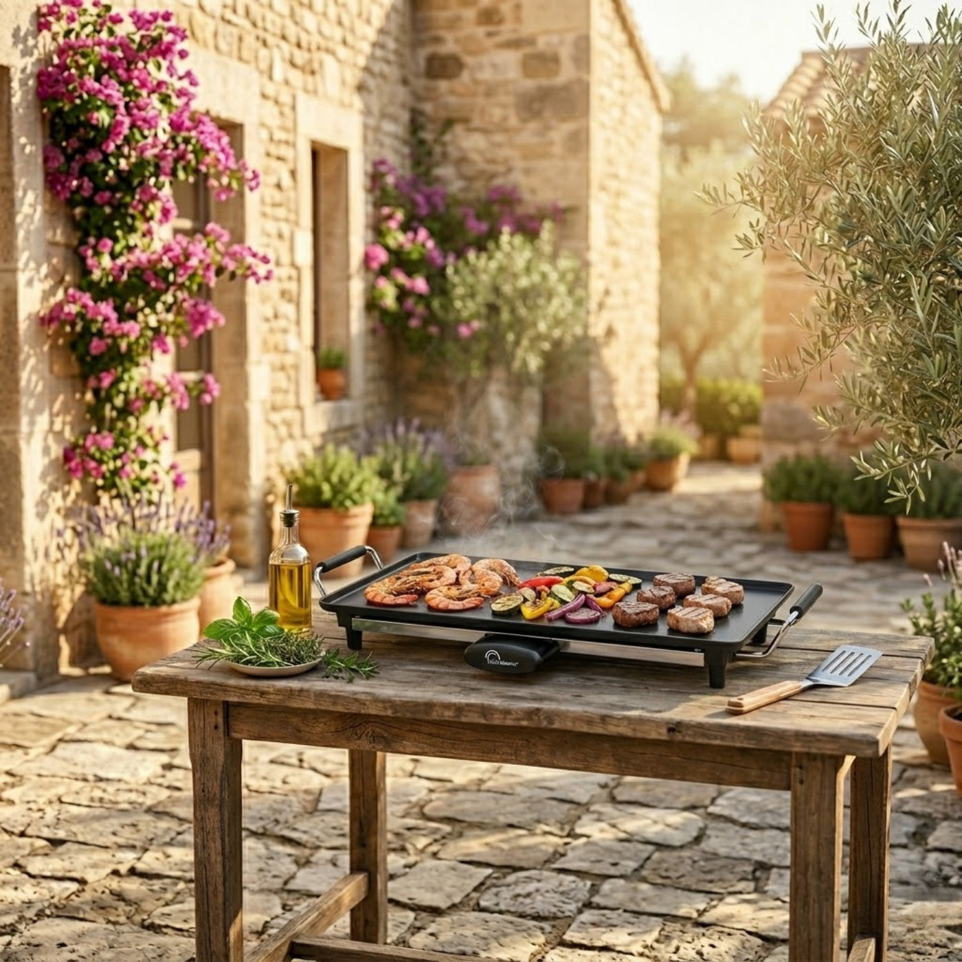 Plancha électrique pour griller à l'intérieur ou à l'extérieur, viandes, poissons, légumes, pommes de terre, tous types d'aliments sans aucune matière grasse.