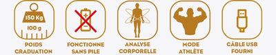 - Technologie unique 4 contacts (4 capteurs Haute Technologie) permettant une double mesure de la bio impédance : c'est plus précis et plus fiable !