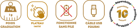 - Fonctionne sans pile, par rechargement USB-C (branchement universel) : 3 heures de charge pour une autonomie de 6 mois (500 pesées) environ