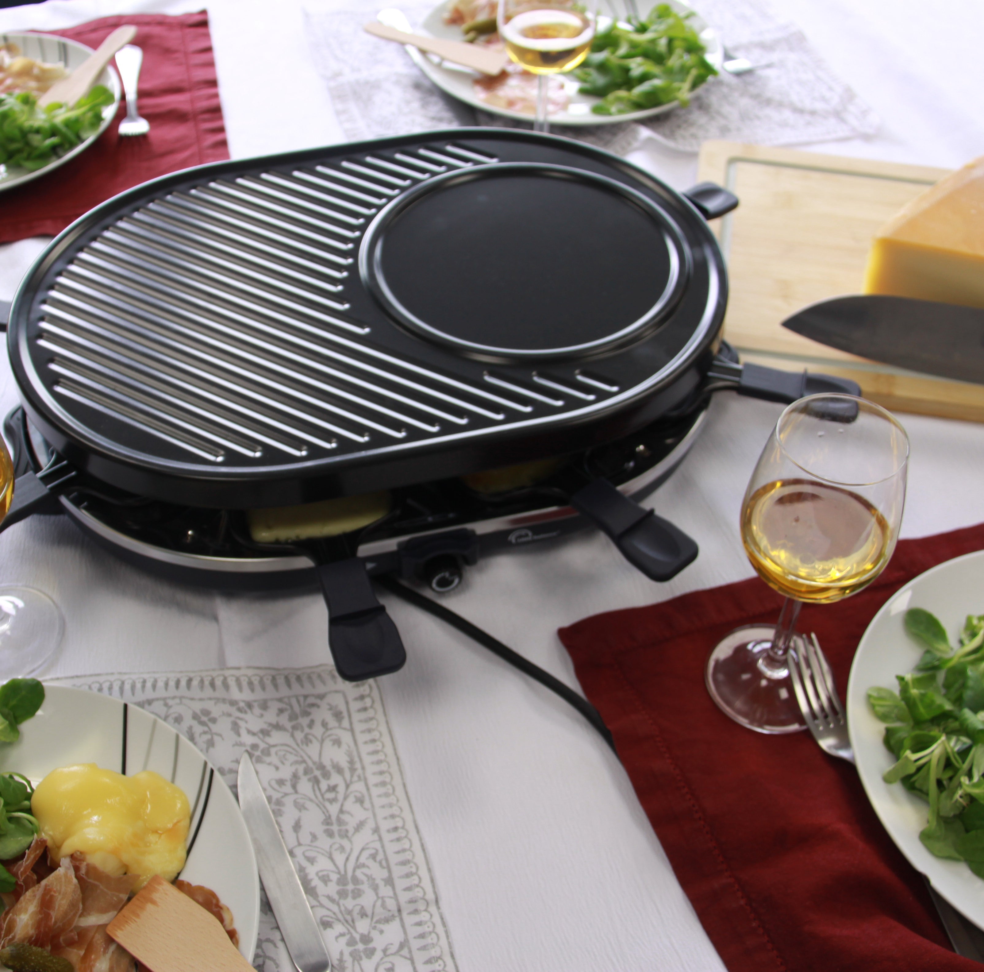 Raclette + Grill + Crêpière = 3 fonctions en 1 seul appareil - A utiliser aussi bien en hiver qu'en été, à l'intérieur et à l'extérieur. Avec des amis, en famille, faîtes des raclettes, des crêpes, des blinis, pancakes ou des grillades ! Idéal jusqu'à 8 personnes.