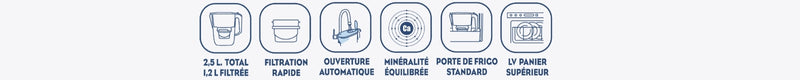 - Carafe filtrante 2,5 litres, avec capacité de filtration 1,2 L. Design élégant et raffiné, conçue pour se loger dans la porte du frigo facilement. Poignée ergonomique pour une prise en main simple et confortable. Couvercle avec un grand clapet pour remplir la carafe.