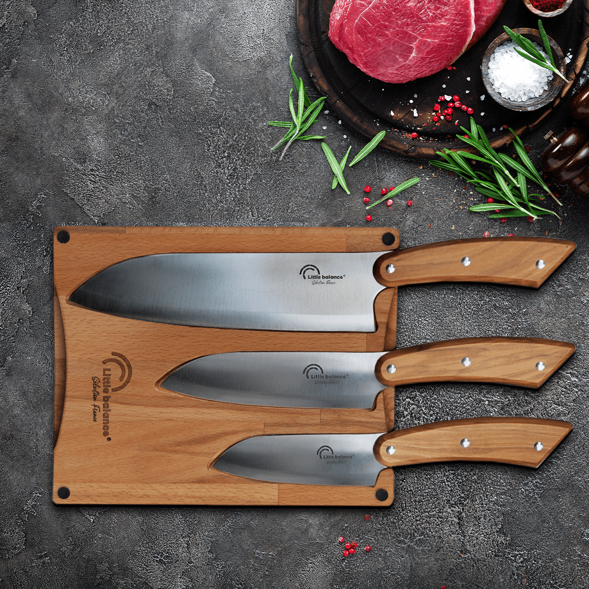 - Planche à découper en hêtre pour 2 utilisations : D'un côté, empreintes aimantées pour ranger les 3 couteaux, en toute sécurité - De l'autre côté, c'est une planche à découper
