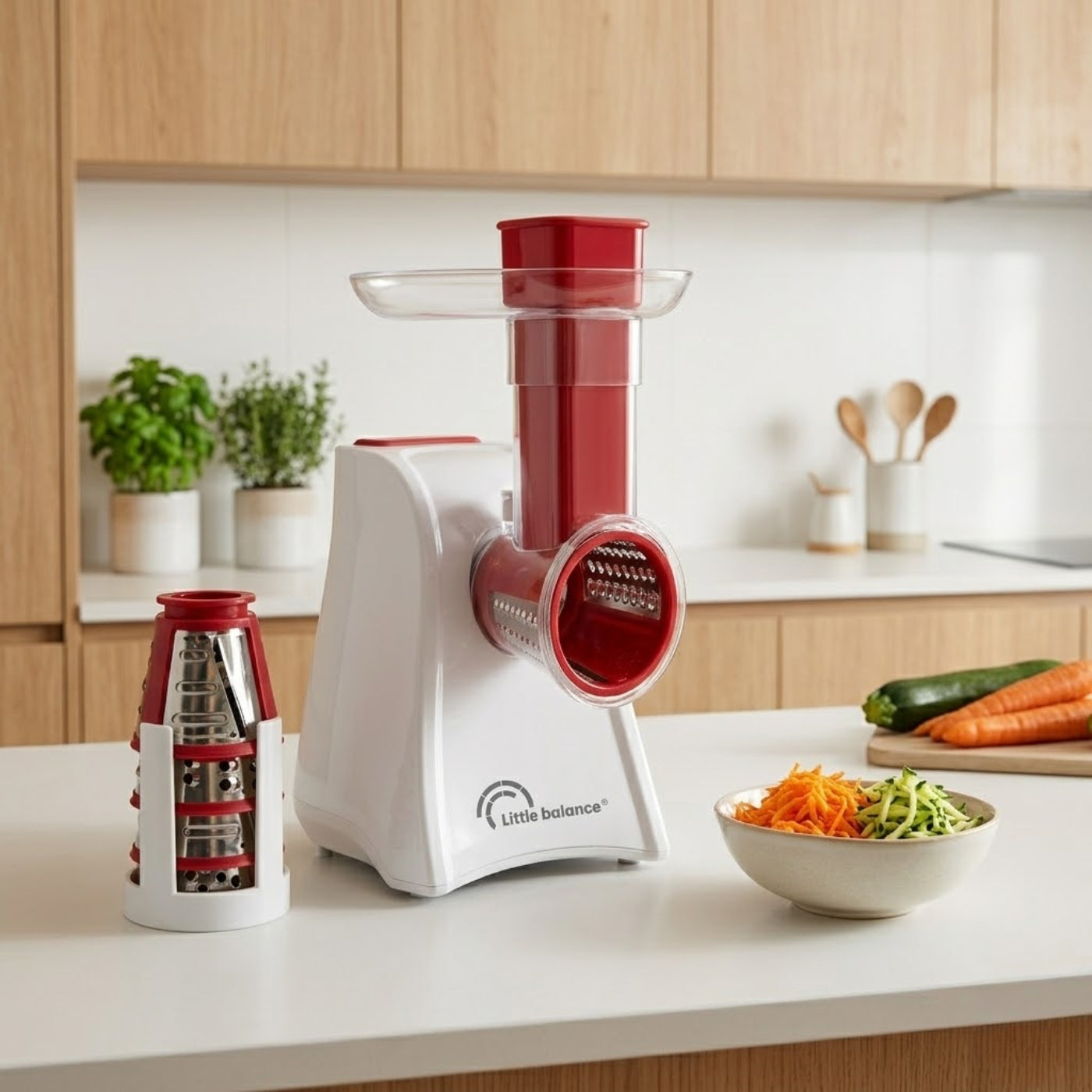 5 cônes en acier inoxydable : Râper fin, râper épais, trancher fin, trancher épais et gratter même les fromages les plus durs : Réussissez facilement et rapidement tous vos gratins, salades, juliennes, fromages râpés…