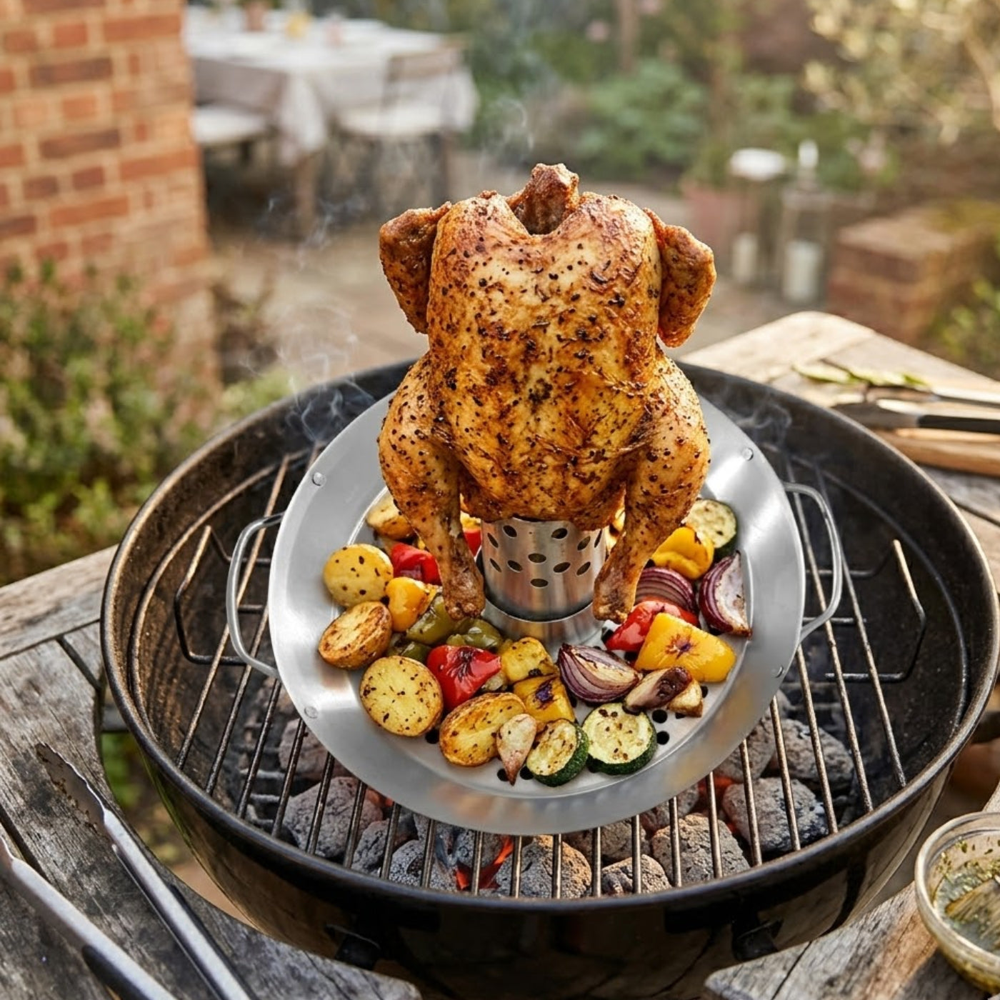 Réalisez facilement un poulet rôti savoureux au barbecue avec ce support de rôtissage poulet et légumes.