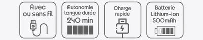 - Batterie Lithium-ion 500 mAh pour des performances fiables.