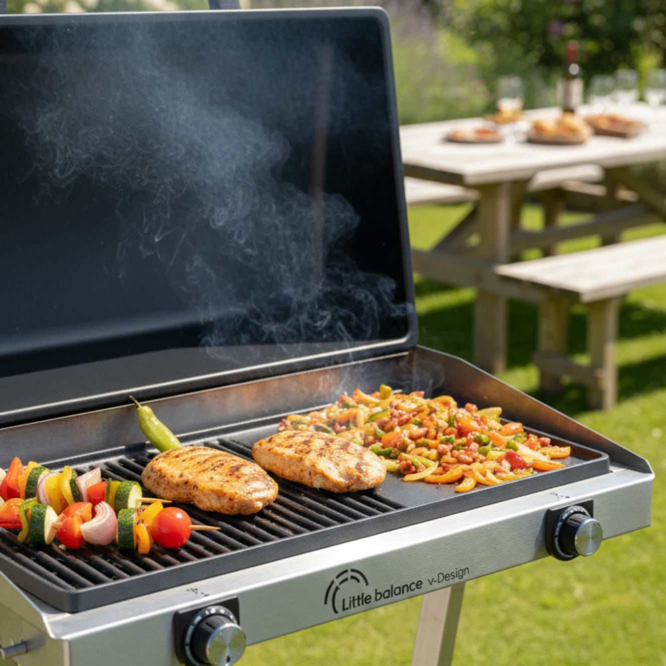 - Dans le jardin, en terrasse ou sur un balcon, la plancha V-Design est idéale pour les grandes familles, ou entre amis (6 à 10 personnes).